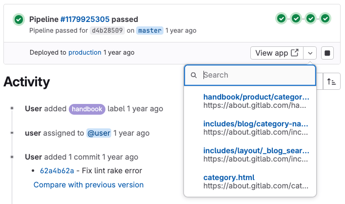 - In the merge request widget, select View app. The dropdown list shows up to 5 mapped pages (with filtering if more are available).