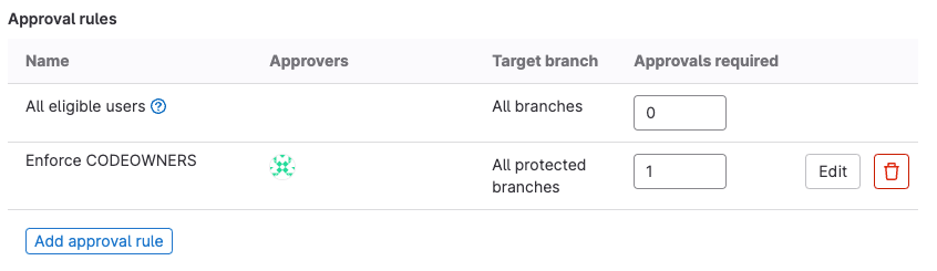 - In the Merge request approvals section, scroll to Approval rules.